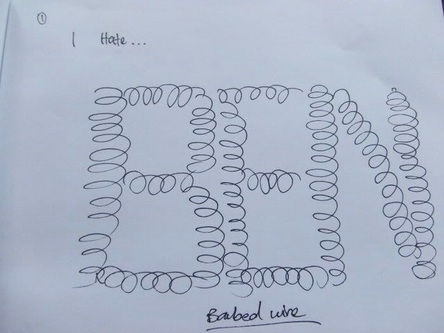 For the second part of assignment 1, which is to show what i hate to do, my initial idea was to say 'I hate barbed wire' because i cannot imagine being pricked by some. So below are some of the thumbnail sketches that i did and the first 3 would be different representations of barbed wire twisted around to form my name 'Ben'.